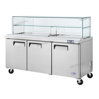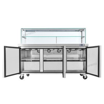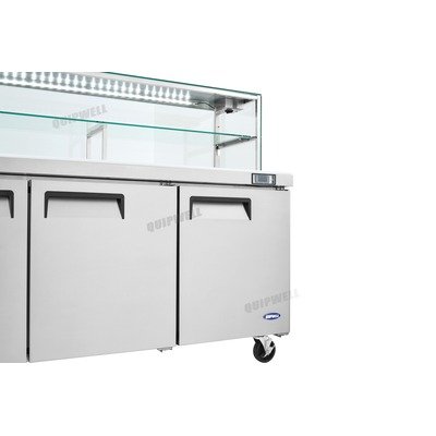 Brand New Stainless Steel 3 Door Glass Display Saladette Prep Table Refrigerator/Fridge with large cutting board – 538L Capacity (Quipwell-SS54G)