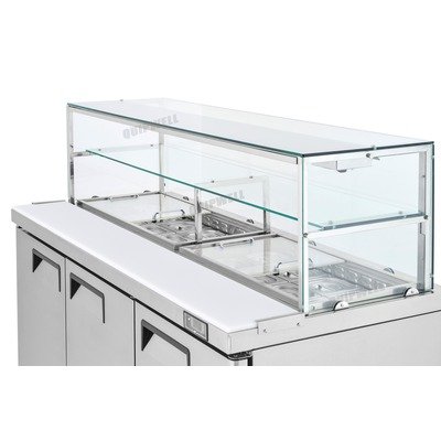 Table-top and glass cover.The saladette refrigerator comes with a tough table-top. The container area comes with removable glass cover.